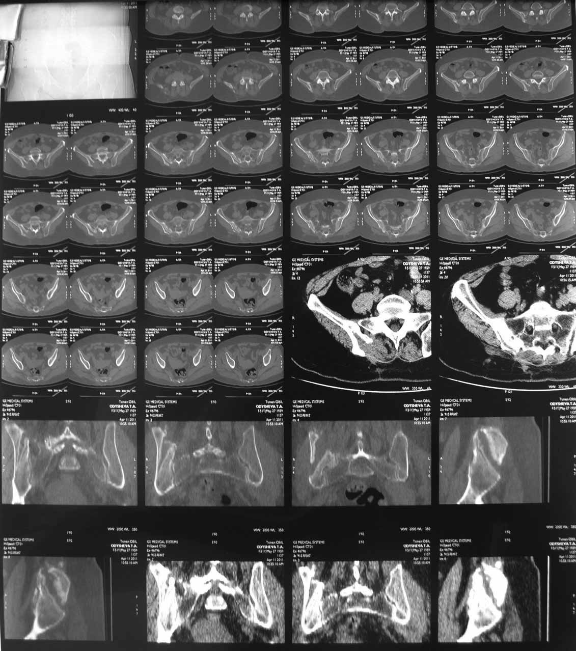На первичных КТ от 19-12-2009 определяется частичное анкилозирование правого крестцово-подвздошного сочленения, а на последних, от 11-04-2011 протяженность анкилозированной зоны значительно больше - сакроилеит прогрессирует, (с левой стороны вроде тоже признаки сакроилеита появились - не очень понятно из-за качества снимка). Значимых дуральных и радикулярных конфликтов действительно нет. "расслоение кости" - рентгенологически выглядит как травматический перелом подвздошной кости. Что делать? - наверное, искать серонегативные спондилоартропатии у ревматолога.