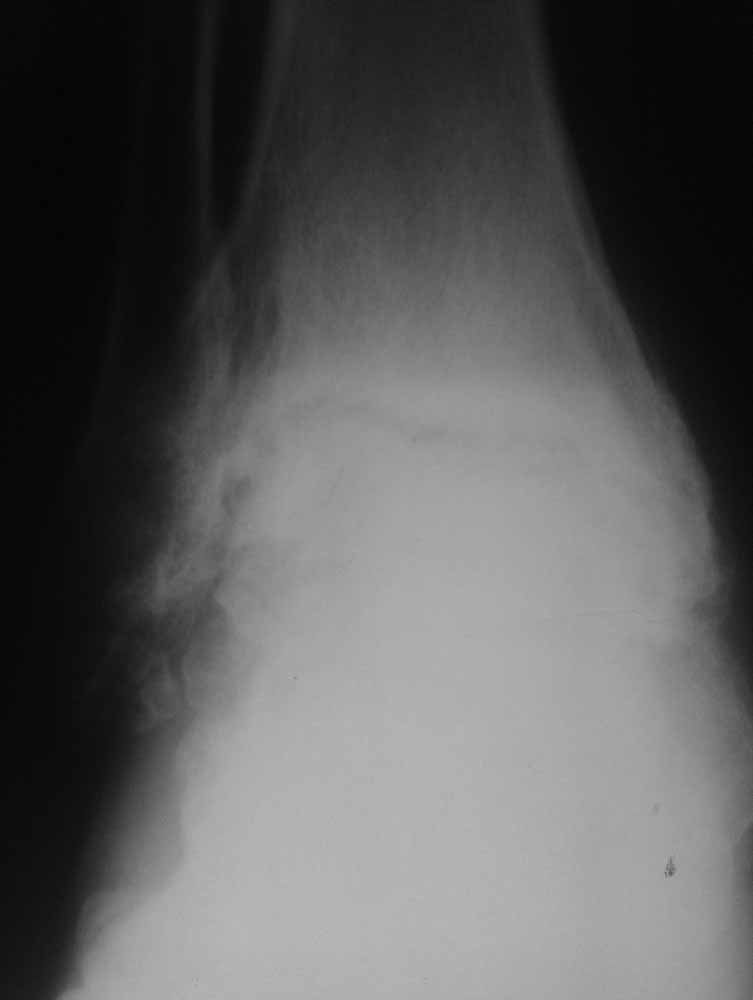 Из того, что я вместе с лучевыми диагностами разглядел - нельзя исключить остеомиелит (?) - есть краевая реакция, куча элементов, похожих на секвестры. Смущает полное отсутствие местной и системной реакции - к анализам не придраться.