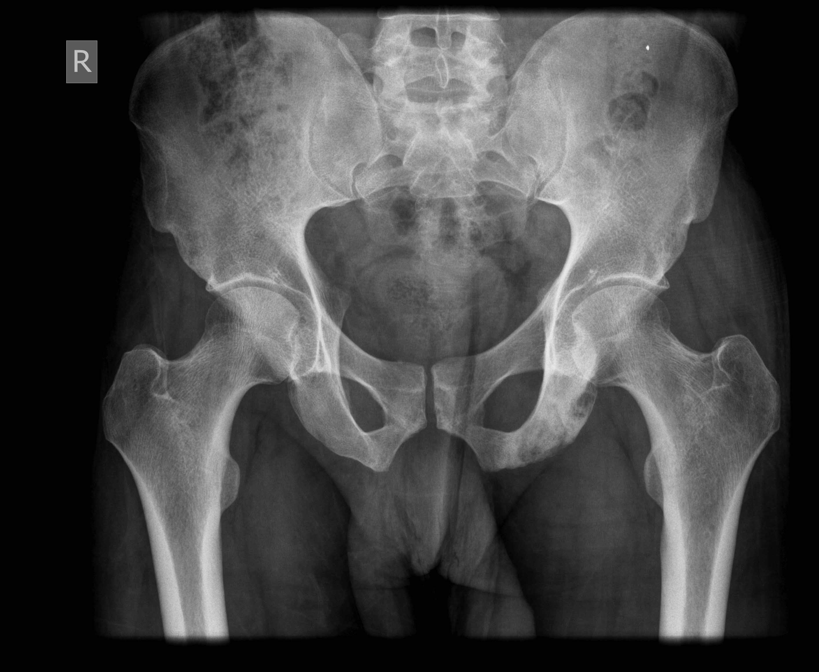 Слева седалищная кость подозрительная. Еще интересно взглянуть на рентген поясничного отдела.