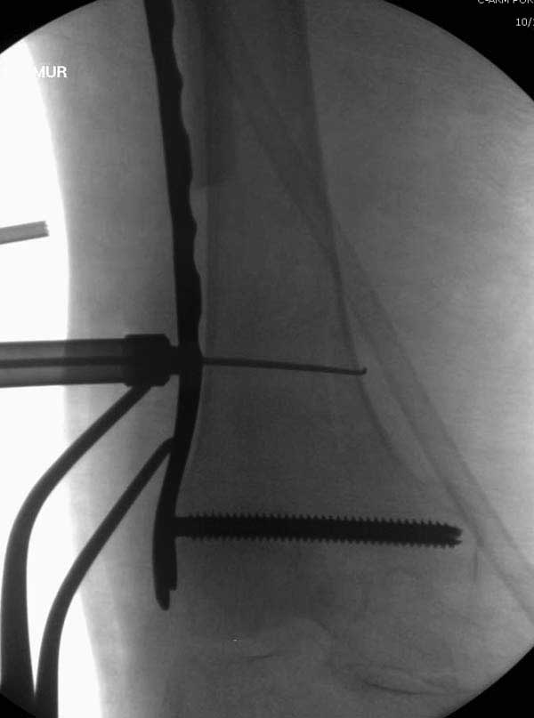 В зависимости от дистанции линии перелома и латерального кортекса надо использовать разной длины barrel, т.е. конец баррели не должен доходить до пределов перелома. Здесь конец длинного ствола упирается в медиальный фрагмент, что мешает созданию компрессии, а более короткий barrel создал бы запас для компрессии. В боковой пластине вместо 4х можно было ограничится двумя шурупами, потому что головка шурупа в 4.5 мм выдерживает давление до 350 кг.
