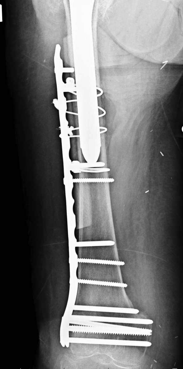 Не по теме, но все же спрошу. А почему выбран именно такой вариант фиксации? Мы бы поставили цефаломедуллярный гвоздь (Gamma) и нагрузка сразу.