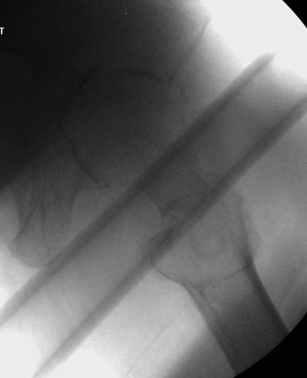 Да, согласен, в такой же репозиции Гамма был бы таким же несостоятельным фиксатором. Проблема в репозиции медиального кортекса, который судя по снимку на месте и опора есть, а на самом деле не так. Как можно его проконтролировать? Дигитально, указательным пальцем пробраться через рану и пощупать? Иногда можно так репонировать перелом шурупом DHS - щупать пальцем язык перелома, который часто около малого вертела и можно до него достать пальцем и при малом разрезе, и поворачивая шуруп еще закручивая его на рукоятке репонировать перелом когда шуруп начнет брать кость. Если остеопороз не сильный и шуруп берет сразу, можно поставить антиротационный шуруп при репонированном положении перелома.