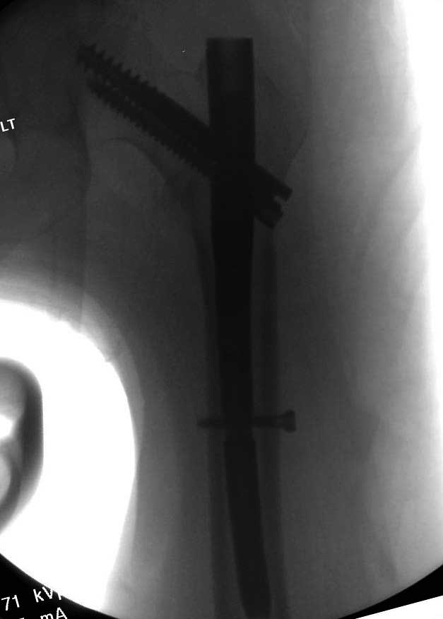 Что касается данного перелома, то по-моему DHS или гамма - принципиальной разницы здесь конкретно нет - медиальная опора сохранена, при правильном исполнении можно ногу нагружать. Технически здесь выполнено на 3+, но если так же винт гаммы поставить - лучше не было бы.