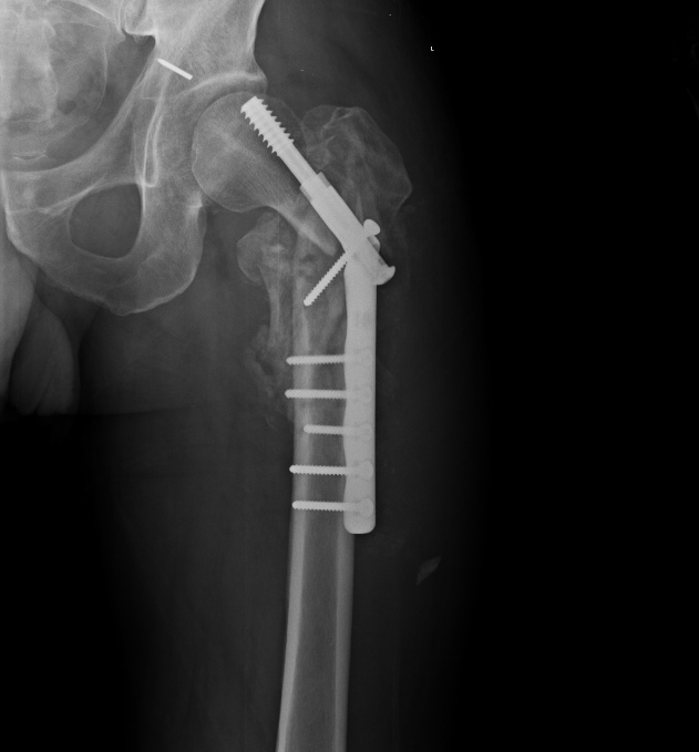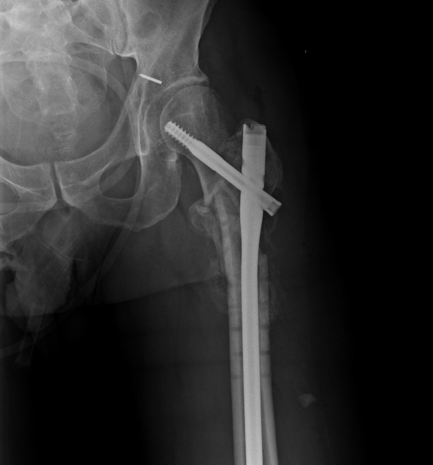 Если ставить более стабильный гвоздь - уже есть дорожка для cut-out как было в "моем" случае. Следовательно нужен угол 85-90, но не 135. Значит blade plate, DCS. Я бы дал шанс, может и напрасный. Есть "за" (хорошая мозоль) и "против" (AVN головки, которая потеряла сферичность, что более склоняет к протезу). Травматологи скажут blade plate, ортопеды - протез с длинной ножкой! За протез и то, что можно мобилизовать пациента, избежать контрактуры которая будет больше если пробовать сохранить головку и срастить перелом.