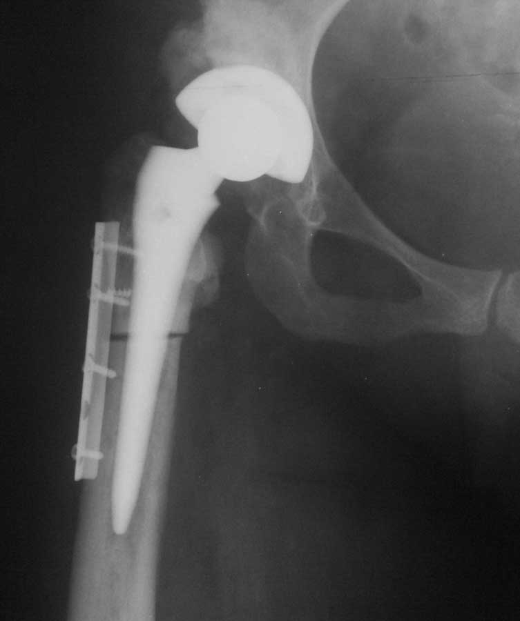 2. Бедренный компонент не выглядит стабильным, и стабильным на протезе с прокимальной фиксацией быть не может. Антиротационная пластинка слегка удерживает дистальный отломок, а плоскость остеотомии сложно назвать хорошо адаптированной. Из чего следует - бедренный компонент удалять. Вертлужный, если стабилен, можно оставить с заменой вкладыша