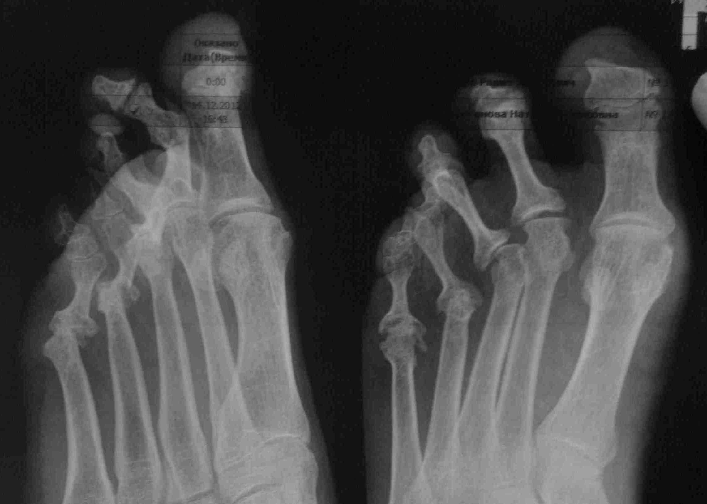 молодой активный пациент 40 лет Стопа на фото. В анамнезе псориаз, но стопы, похоже, пострадали в результате подагры (заключение немецких коллег и аллопуринол помогает), пальцы так завернуло после одной атаки. Основные жалобы на деформацию 2-3, в межфаланговых суставах контрактуры фиксированные. Планирую резекцию головок основных фаланг 2-3 с временной фиксацией спицей. С плюснефаланговыми суставами что-то нужно делать? Другие варианты?