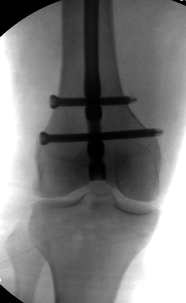 В фиксации тибиал плато надо соблюдать осторожность, потому что по снимку кажется поврежденной только медиальная часть, и медиальные переломы имеют тенденцию вовлечения задней поверхности плато. Боковой снимок покажет, куда идет линия перелома, а также покажет состояние перелома надколенника. Фиксировать надо buttress-опорной пластиной иначе винты не удержат варусный коллапс. В зависимости от вовлечения разгибательного механизма фиксация надколенника.