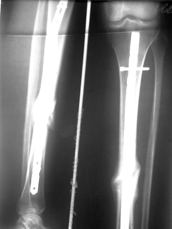 Здравствуйте! Присоединяюсь к мнению Александра Челнокова. ИМХО: на рентгене - перифокальная костная мозоль. Думаю, что нужно оставить всё, как есть и продолжить нагружать конечность. А если всем после БИОС рубить малоберцовые кости (т.к. они срастаются задолго до момента динамизации стержня), то, что тогда получится? Спасибо.