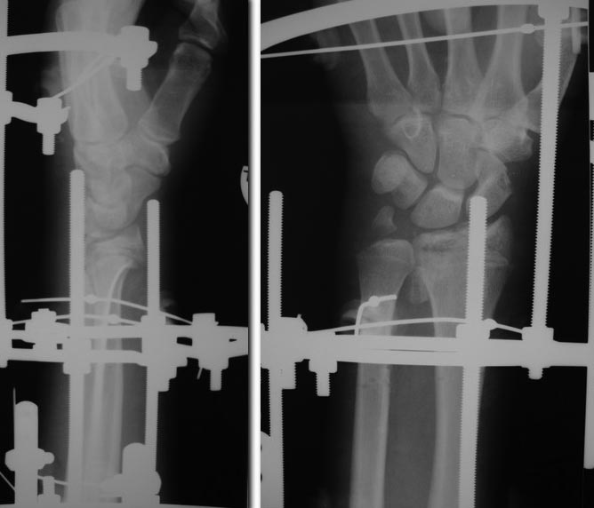Доброго времени суток, глубокоуважаемые коллеги! Прошу помощи по лечению суставного перелома дистального метаэпифиза лучевой кости Пациент 22 лет. Травма в результате ДТП 14.11.13. Диагноз: Сочетанная травма. Тупая травма грудной клетки. Закрытый перелом 2, 3, 4 рёбер слева, 4, 5 справа. Ушиб лёгких. Закрытый оскольчатый перелом дистального метаэпифиза левой лучевой кости со смещением отломков, вывихом головки локтевой кости, нейропраксией срединного и локтевого нервов. Ушибленная рана головы. Первично обращался в другое больничное учреждение, где произведено ПХО,закрытая репозиция. От госпитализации отказался. Через 2 дня обратился за помощью по месту жительства. Госпитализирован. Левое предплечье резко отёчно. Выявлена клиника нейропатии срединного и локтевого нервов с чувствительными расстройствами. Произведена повторная закрытая репозиция, которая не увенчалась успехом.Наложен аппарат внешней фиксации. Подвывих кисти устранён. Вывих локтевой кости вправлен. Клиника нейропатии локтевого нерва купирована. На настоящий момент сохраняется гипостезия 1п левой кисти, отёк купируется.Ввиду молодого возраста пациента и оскольчатого характера перелома планируем вторым этапом произвести погружной остеосинтез. Прошу помощи с планированием остеосинтеза. Удастся ли стабилизировать перелом из ладонного доступа, или необходим и тыльный? Каким имплантатам отдать предпочтение?