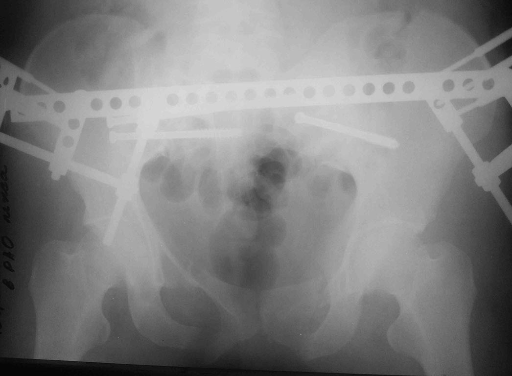 Сначала стабилизировали правую половину (крестец), вторым этапом сначала плечо, потом задние отделы слева, дальше аппарат спереди. Репозиция в положении на животе, свесил таз со стола, согнул ногу и тракция в этом положении.