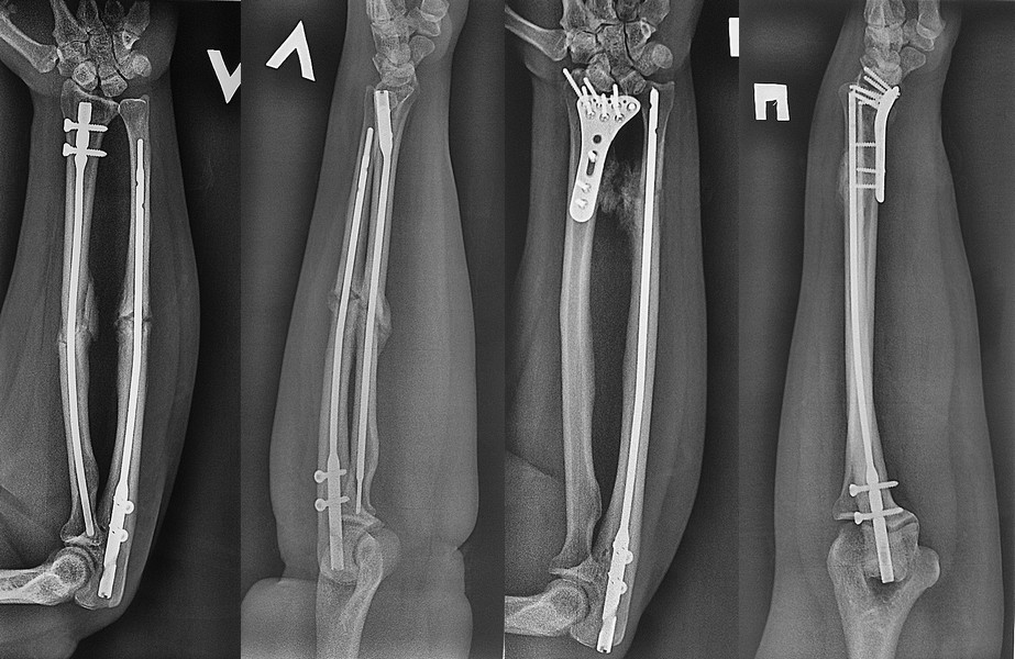 Пациентка, 40 лет, в составе политравмы получила закрытые переломы обоих предплечий. Два месяца назад выполнили CRIF правого предплечья штифтами. Левую локтевую кость CRIF штифтом и дистальный метаэпифиз лучевой кости ORIF волярной пластинкой. Индометацин не получала.