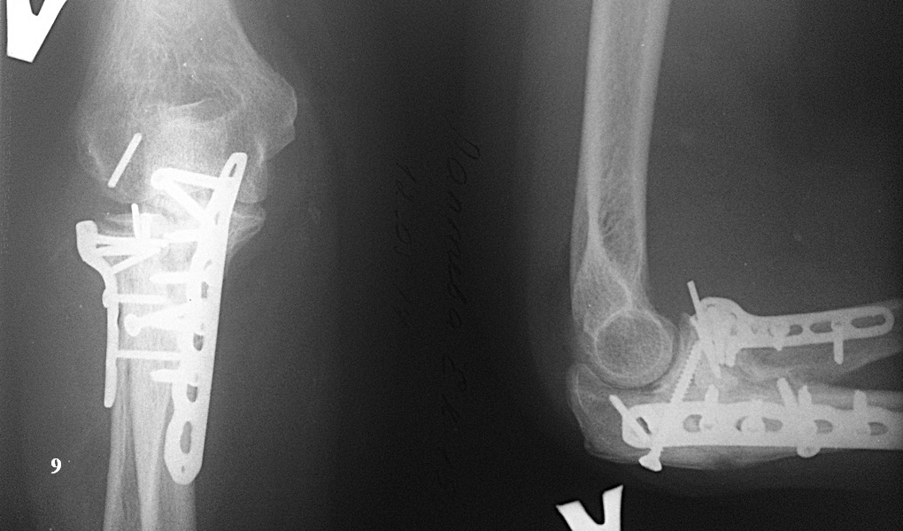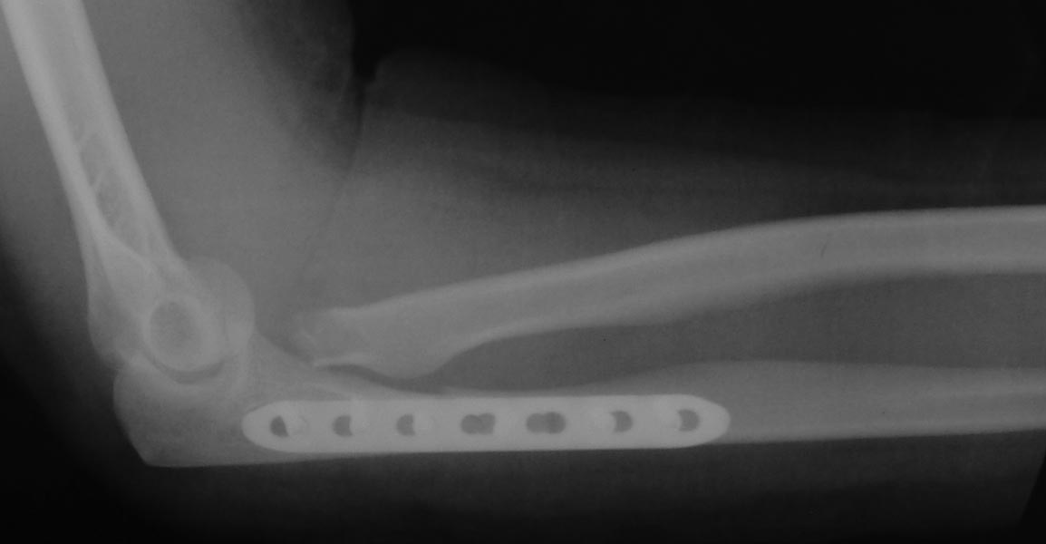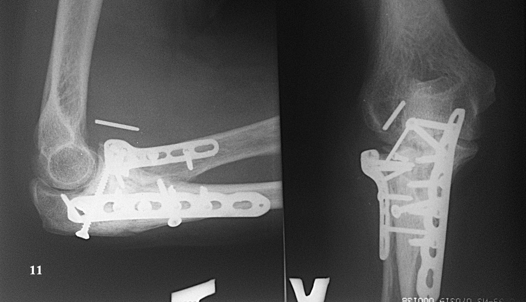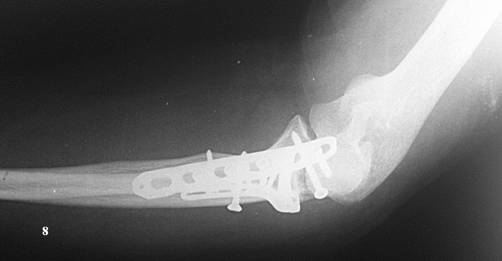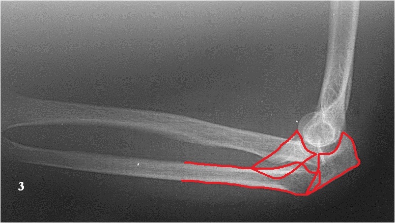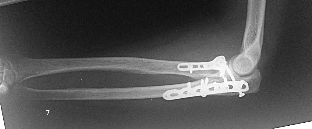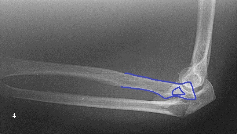 Хочу попросить совета у сообщества по поводу следующего клинического случая. Женщина, 65 лет. Закрытый перелом Монтеджи слева в октябре 2013 года. (рис. 1, 2). Для наглядности сделал скиаграмму перелома (рис. 3, 4). На 8-е сутки накостный остеосинтез пластинами с угловой стабильностью. Головка луча была восстановлена из отломков (рис. 5) и собрана на спицах одну из которых скусили и оставили под пластиной.(рис. 6). Вроде получилось стабильно, видео на операции по этой ссылке: