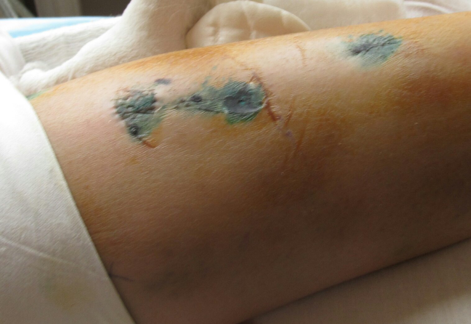 Раны голени почти зажили, под корочкой.