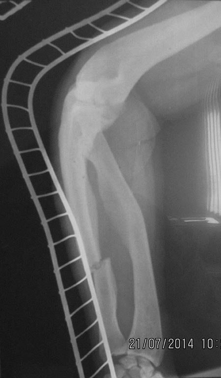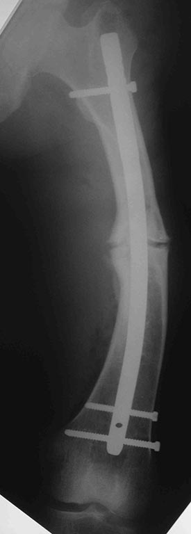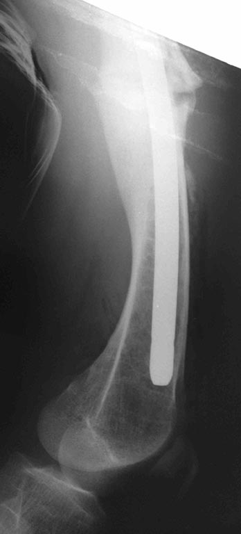 Посмотрите, подойдёт ли туда по размеру гвоздь от большой берцовой кости или от плеча. Они покороче и могут подойти, так как канал у пациента короткий и широкий. Гвоздь будет тонким, по сравнению с его каналом, но этого будет достаточно для стабилизации. Если есть машина Midas Rex с насадками для резки железа, то можно и обычный гвоздьь для бедреной кости подрезать и просверлить в нём дырку дистально.