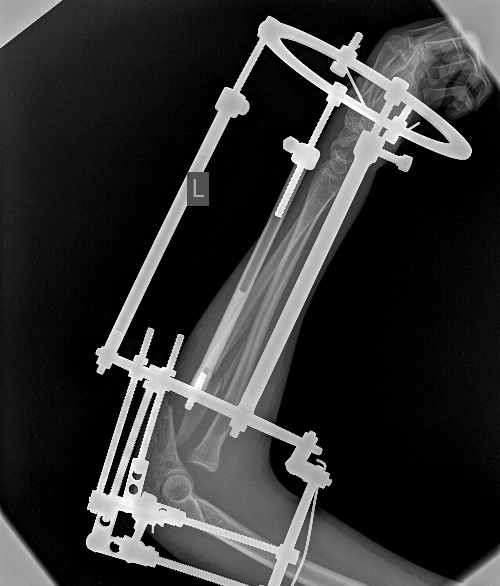 Мы бы удалили пластину. Аппаратом постепенно восстановили бы взаимоотношения. И заштифтовали бы локтевую кость, смоделировав стержень, чтобы он был напряжен в противоположную сторону тому, как сейчас выглядит локтевая кость, т.е. вогнутой стороной в сторону межкостного промежутка. Чтобы лучевая кость удерживалась натяжением межкостной мембраны. Пример в приложении. Тут был более свежий случай, поэтому вправилось одномоментно.