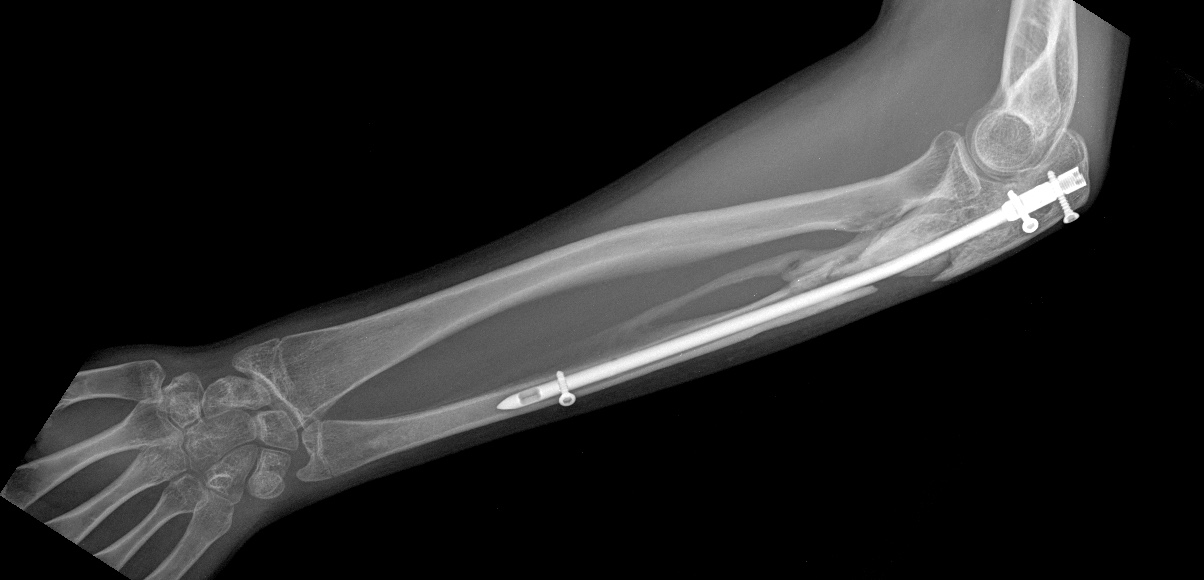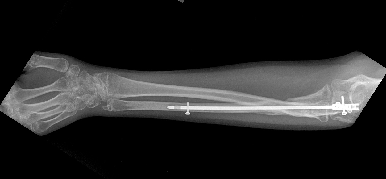 Оперирована около 1 года назад. Радиоульнарное сочленение было вправлено, фиксировано спмцей, спица удалена. На сегодня имеем такую картинку. Работает водителем трамвая.Что посоветуете в этом случае? Восстановить длину локтя - это понятно. как лучше поступить с радиоульнарным сочленением?