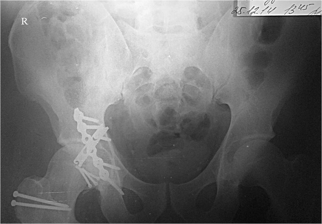 При поступлении выполнено закрытое вправление головки бедра, налажено скелетное вытяжение. Контрольный рентген показал разницу в ширине суставных щелей в сравнении с неповрежденной стороной. Сделали КТ, которое подтвердило наличие внутрисуставного фрагмента задней стенки вертлужной впадины и перелом нижне-медиального сегмента головки со смещением (Pipkin IV). Через 12 дней выполнен остеосинтез головки 3-мя самокомпрессирующими винтами Герберта. Доступ Kocher-Langenbeck с флип-остеотомией большого вертела и задним хирургическим вывихом головки бедра. Интерпонирующий внутрисуставной фрагмент представлял собой лабрум с тонкой костной пластинкой от заднего края впадины. Фрагмент извлечен и фиксирован техникой spring-plate. Обращал на себя внимание значительный дефект хряща головки бедра в нагружаемой зоне (как результат контакта головки с внутрисуставным фрагментом). Глубина повреждения хрящевого покрытия в центральной части дефекта достигает кости. Ничего не делали, расчитывая на замещение дефекта фиброзным хрящом. Промыли головку с впадиной, вправили вывих и ушились с активным дренажом. Из литературы известно, что повреждения Pipkin IV, а особенно Pipkin III, нередко приводят к развитию тяжелого коксартроза с последующей заменой сустава. Возникают вполне резонные вопросы о целесообразности остеосинтеза в нашем частном случае, где есть дефект хряща в нагружаемой зоне. Что скажет сообщество? Есть ли смысл в первичном эндопротезировании, несмотря на еще молодой возраст? Есть ли надежные хирургические приемы по восстановлению хрящевого покрытия? На ум приходит что-то вроде микроперфораций, донорские хрящевые столбики и т.д. Есть ли резон? С уважением, Никита Заднепровский ГБУЗ НИИ Скорой Помощи им.Н.В.Склифосовского ДЗМ Отделение сочетанной и множественной травмы