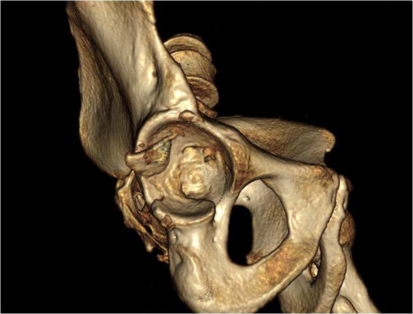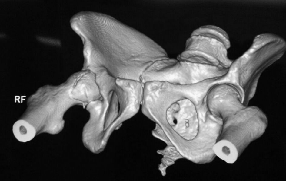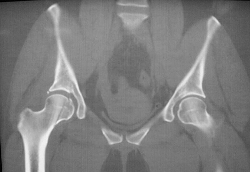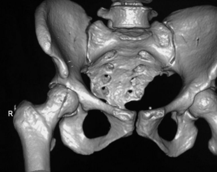 При поступлении выполнено закрытое вправление головки бедра, налажено скелетное вытяжение. Контрольный рентген показал разницу в ширине суставных щелей в сравнении с неповрежденной стороной. Сделали КТ, которое подтвердило наличие внутрисуставного фрагмента задней стенки вертлужной впадины и перелом нижне-медиального сегмента головки со смещением (Pipkin IV).