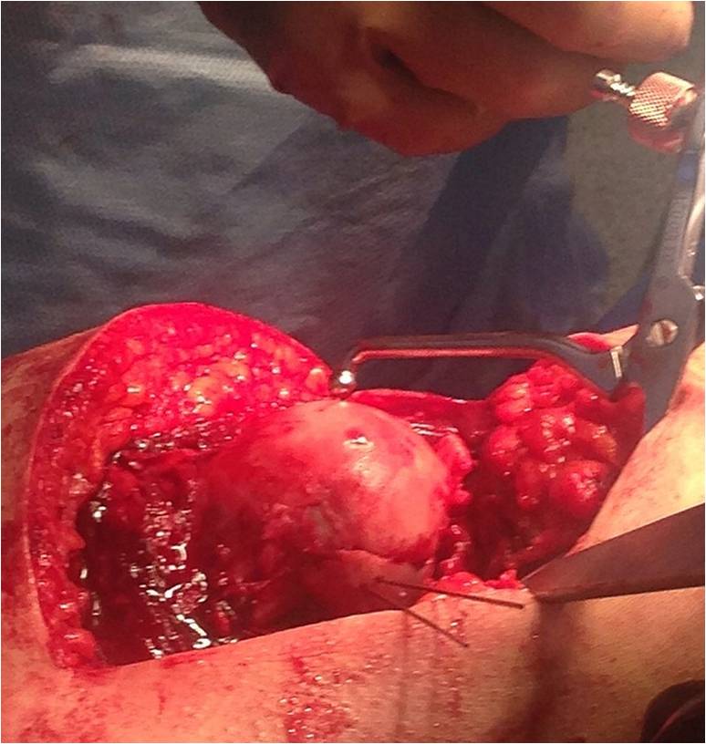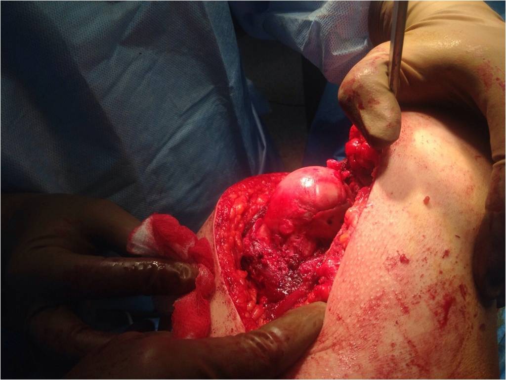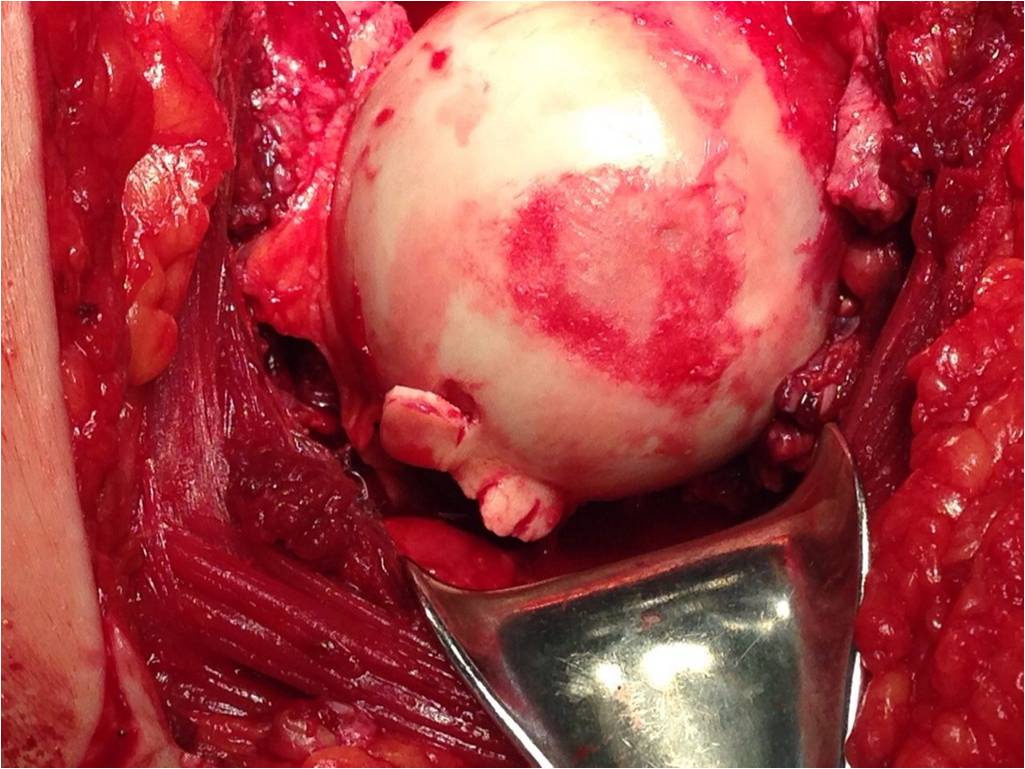 Обращал на себя внимание значительный дефект хряща головки бедра в нагружаемой зоне (как результат контакта головки с внутрисуставным фрагментом). Глубина повреждения хрящевого покрытия в центральной части дефекта достигает кости. Ничего не делали, расчитывая на замещение дефекта фиброзным хрящом. Промыли головку с впадиной, вправили вывих и ушились с активным дренажом.