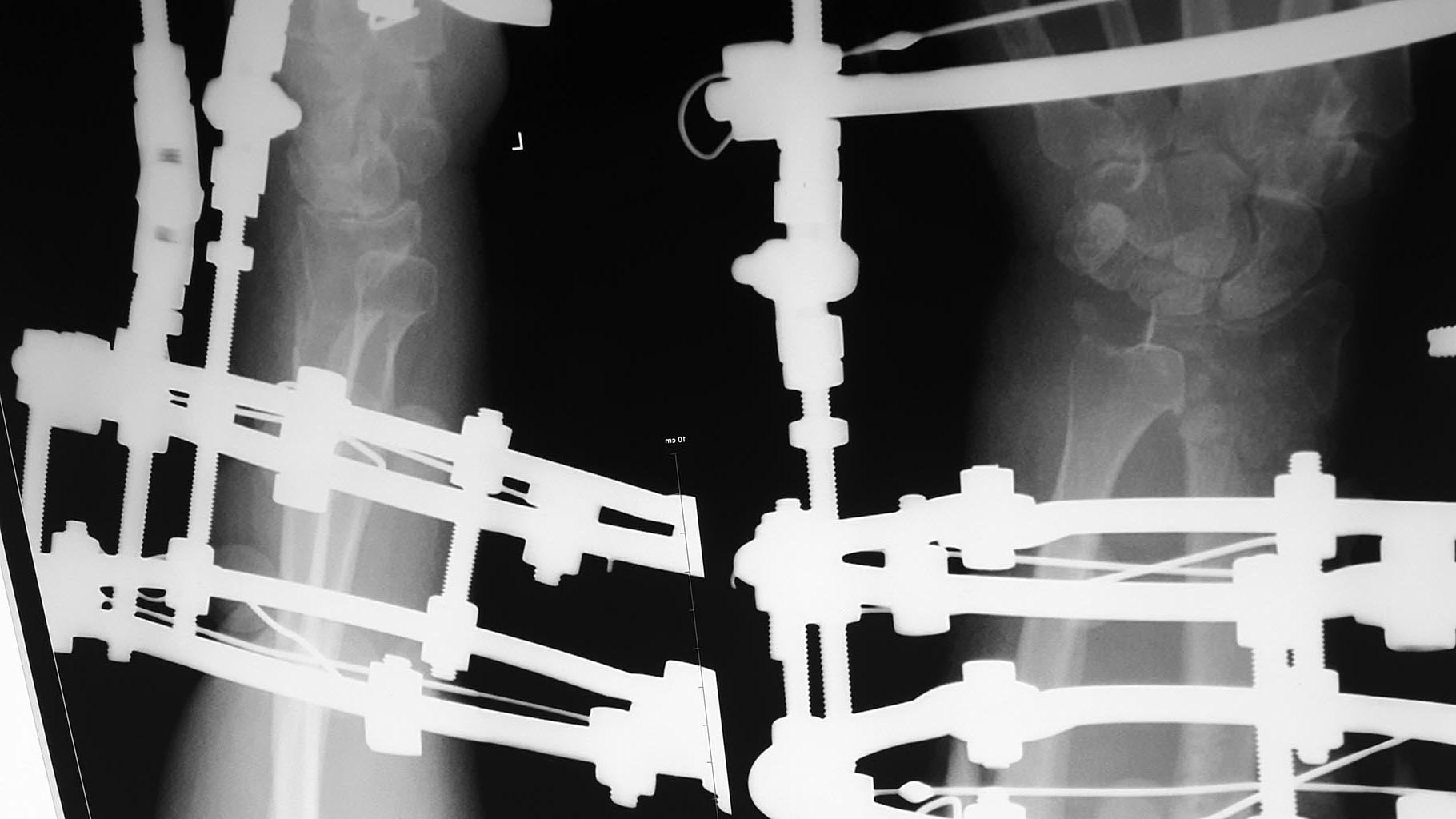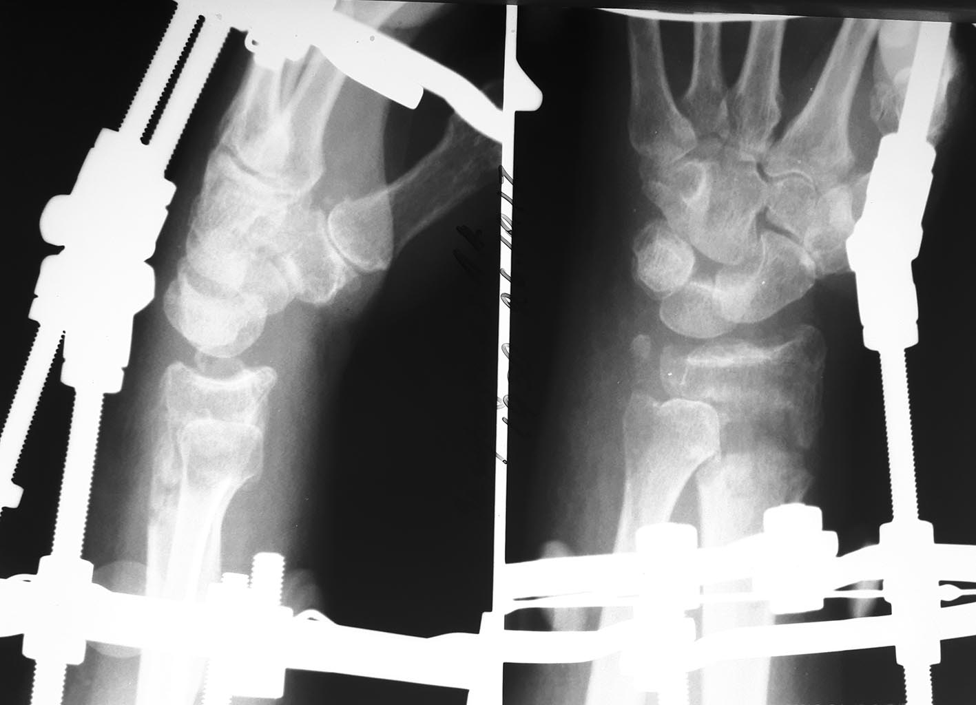 Пациентка 60 лет, 2 мес назад перелом дистального эпиметафиза лучевой кости, шиловидного отростка, Наложен АВФ. По разным причинам продолжила лечение у хирурга, который проводил дистракцию. Сожалею, первичные снимки предоставить не могу. Рентген при поступлении и после "сброса" дистракции. Сейчас думаем, что с этим делать,четкого плана пока нет, какие у вас мысли по этому поводу?