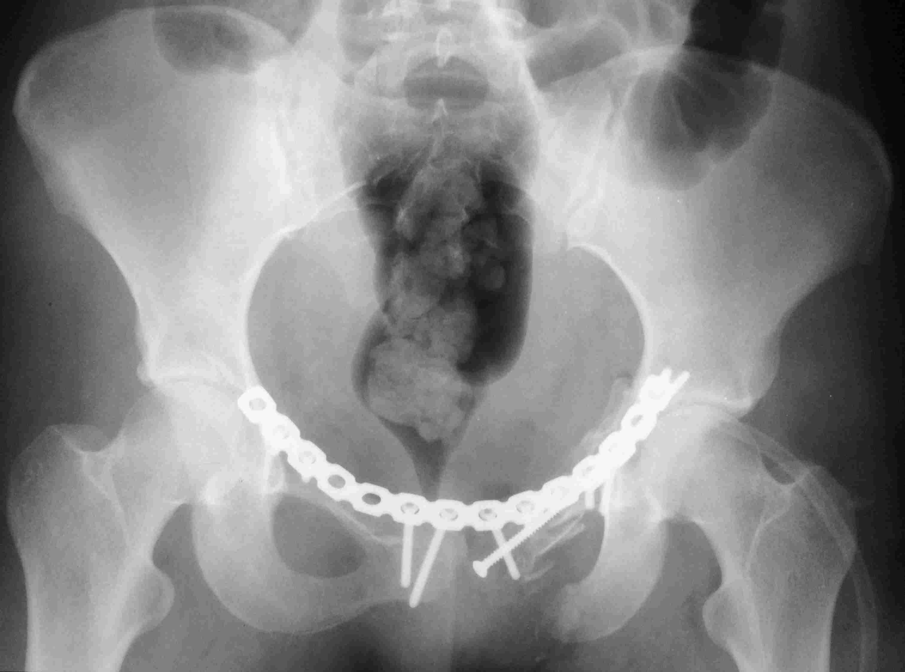 Постоп. Верхняя ветвь возле шейки мочевого пузыря, нижняя так же где-то глубоко в мышцах, ротирована. Обе практически лишены кровоснабжения. лонное сочленение фактически свободно лежащее, справа почти целое, но ветви сломаны возле него. Слева часть лонного сочленения цела на 2/3. интраоперационно подвижность правой половины таза. Постоп все стабильно, но все же планирую дополнительно провести IS винт справа.